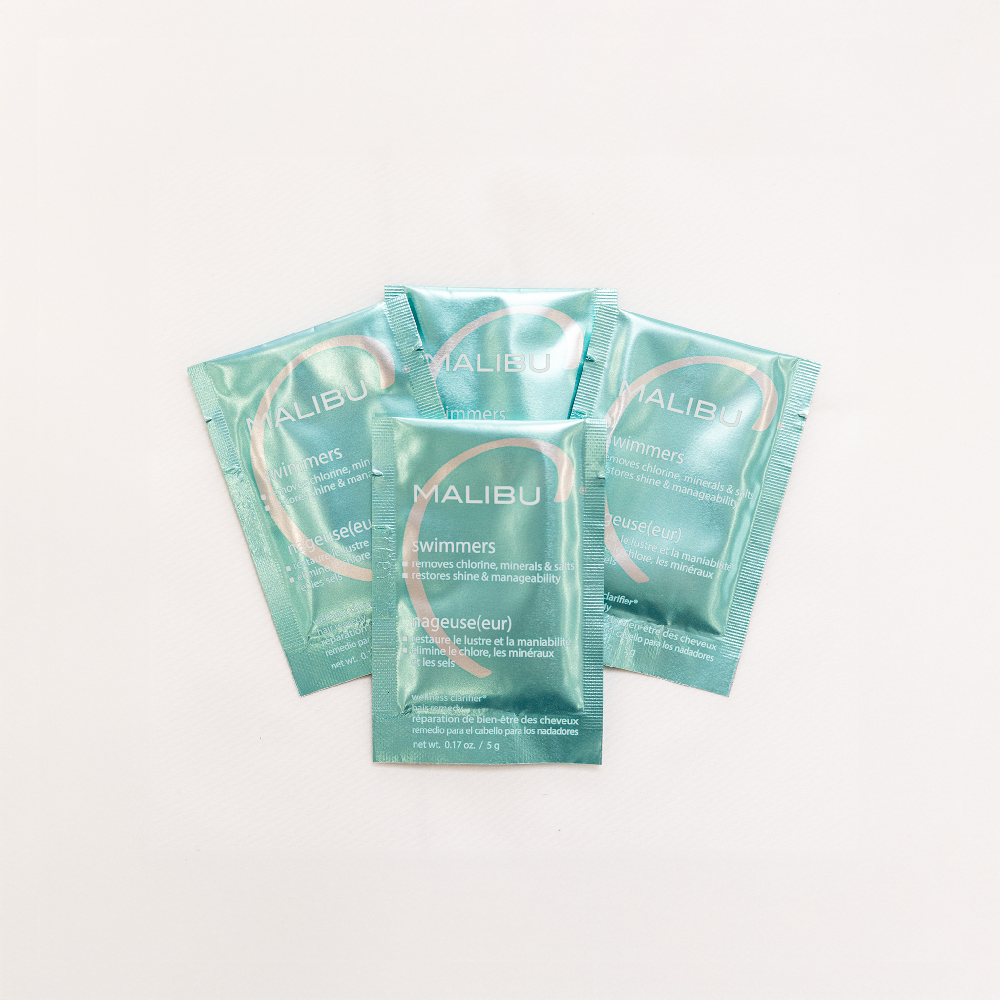 Shampoo & rinse — We begin by gently washing with our Malibu C shampoo to remove pool water and surface chlorine.
