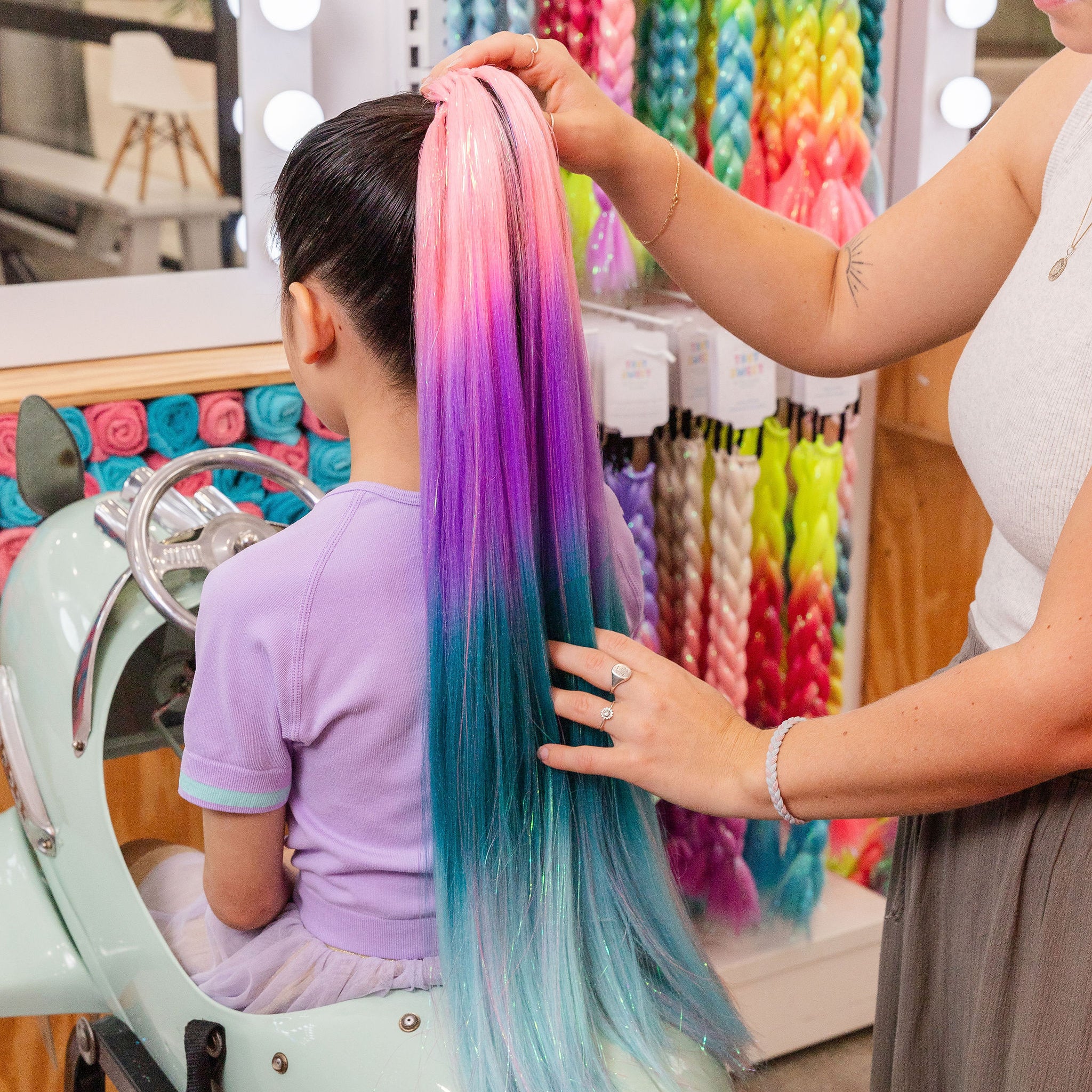 TO USE Simply brush the hair as you would to create a regular ponytail - feed the hair through the lackie and keep twisting into place until it feels snug and comfortable. For extra support you can always use a plain lackie first then finish off with this ponytail. Once covering the hair you can either leave it sitting on top or you can braid or plait it into your child's own hair - see examples in our photos.